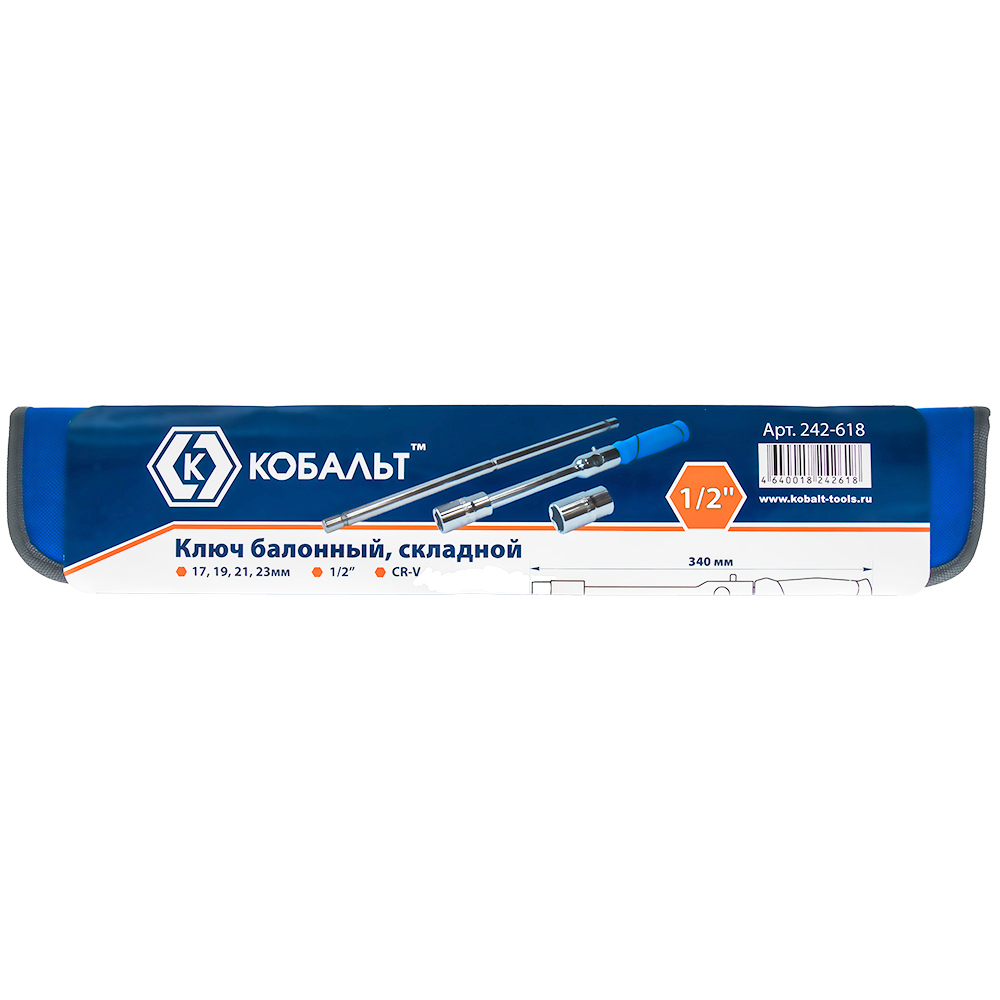 Ключ баллонный складной крестообразный КОБАЛЬТ 242-618, предназначен для завинчивания/отвинчивания колесных гаек и болтов автомобилей с размерами гайки 17, 19, 21, 23мм. Имеет присоединительный квадрат 1/2" для установки головок других размеров. Изготовлен из хром-ванадиевой стали (CrV). Ключ имеет вращающуюся двухкомпонентную рукоятку, для быстрого отвинчивания гаек. Съемный рычаг ключа быстро и удобно фиксируется кнопкой в 2-х положениях, образуя: крестообразный ключ с длиной рычага 200мм или Г-образный ключ с длиной рычага увеличенной до 400мм для получения высокого крутящего момента при страгивании сильно затянутых гаек. Ключ поставляется в удобном матерчатом чехле на молнии с фиксацией липучками, позволяет дополнительно положить несколько небольших необходимых инструментов.
