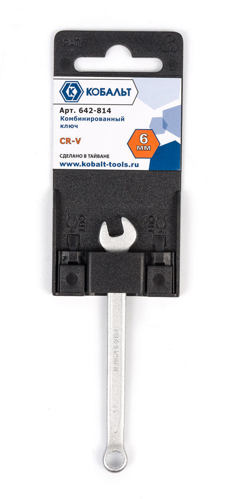Ключ комбинированный 6 мм КОБАЛЬТ 642-814, предназначен для отвинчивания/завинчивания мелкого резьбового крепежа с шестигранными головками при производстве строительных, электротехнических, монтажных и автосервисных работ. Изготовлен по стандарту DIN 3113 из хром-ванадиевой стали Cr50BV30, с закалкой рабочих поверхностей до 47-50 HRC. Защитное матовое хромовое покрытие ключа, нанесенное электролитическим способом, предохраняет от коррозии, улучшает внешний вид, при этом ключ не скользит в ладони в процессе работы. универсальный гаечный ключ, состоящий из двух рабочих профилей - рожкового и накидного. Используется при проведении слесарно-монтажных работ на производстве, в автомастерских и в быту.