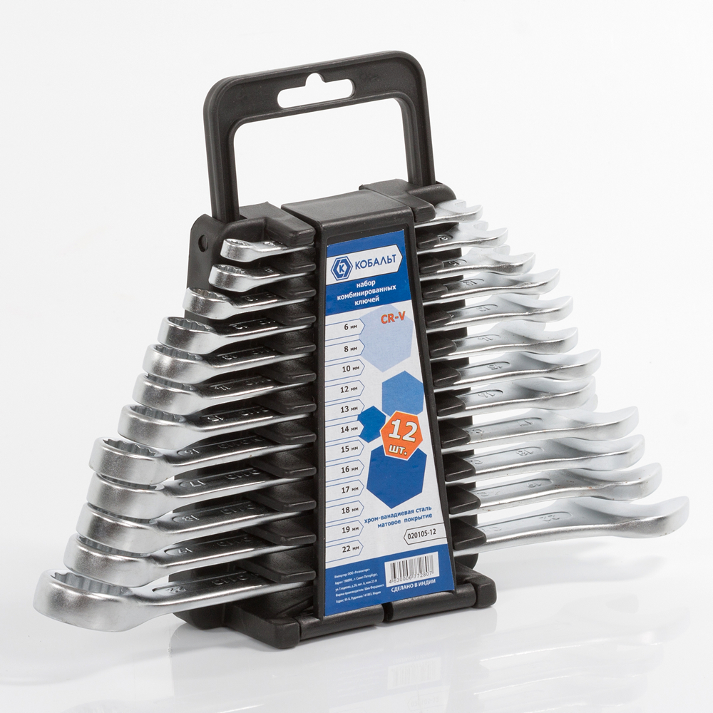 Набор ключей комбинированных 12 шт. КОБАЛЬТ 020105-12, предназначен для отвинчивания/завинчивания резьбового крепежа с шестигранными головками при производстве строительных, электротехнических, монтажных и автосервисных работ. Изготовлены из хром-ванадиевой стали 31Cr-V, с закалкой рабочих поверхностей до 47-50 HRC. Защитное матовое хромовое покрытие ключей, нанесенное электролитическим способом, предохраняет от коррозии, улучшает внешний вид, при этом ключи не скользят в ладони в процессе работы. Небольшая толщина ключей позволяет отвинчивать узкие гайки и крепеж в труднодоступных местах.