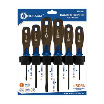 Набор отверток КОБАЛЬТ POLYWOOD, 6 ШТ: РН0, РН1, РН2, SL3, SL5, SL6, CR-V, древ.-полимер. рукоятки, пласт. держатель, подвес