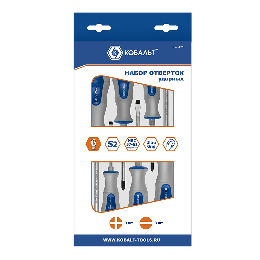 Набор отверток КОБАЛЬТ ударных Ultra Grip, 6 ШТ: РН1, РН2, РН3, SL 5.5, SL6.5, SL8, сталь S2, коробка