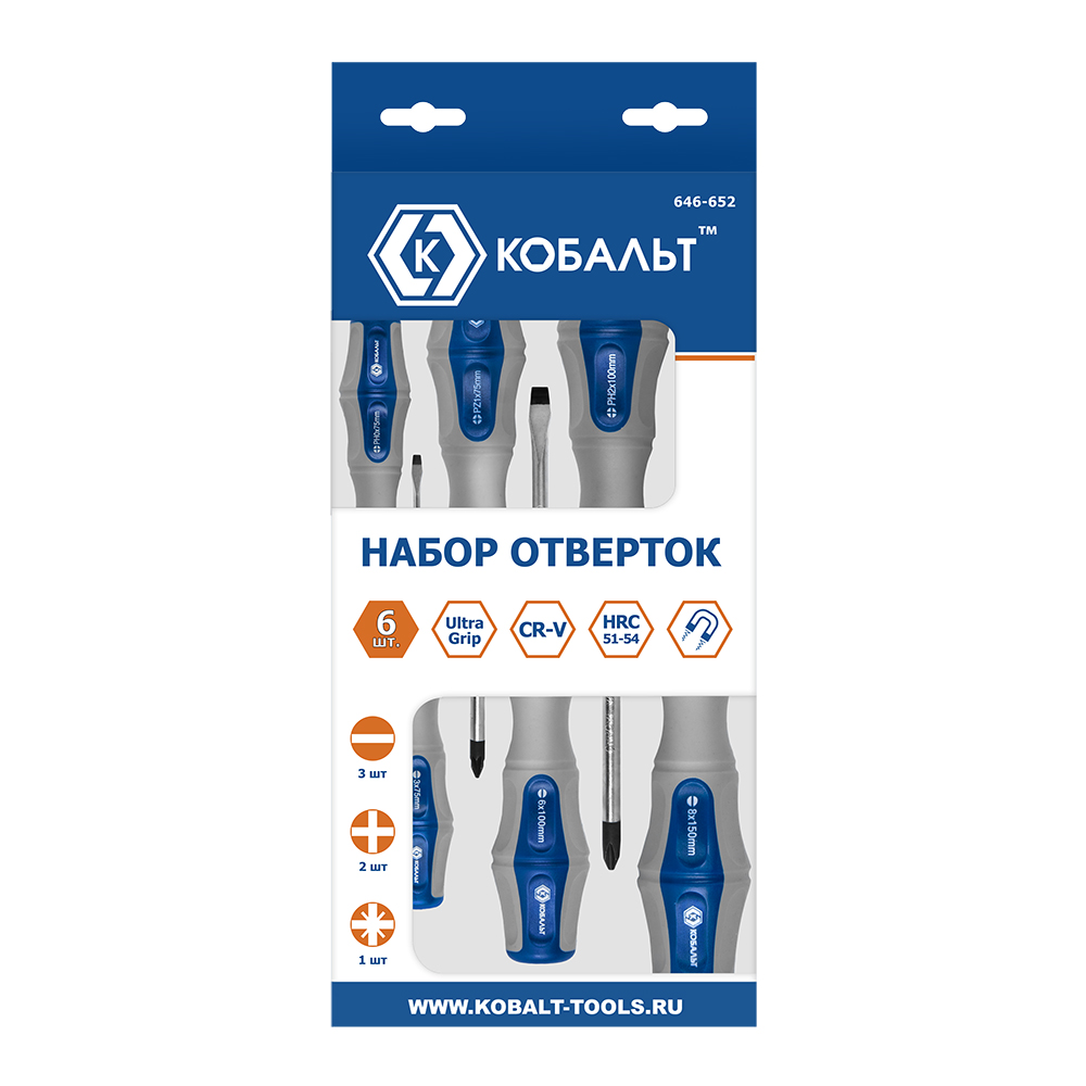 Набор отверток КОБАЛЬТ Ultra Grip, 6 ШТ: РН1, РН2, SL4, SL5, SL6, SL7, CR-V, блистер
