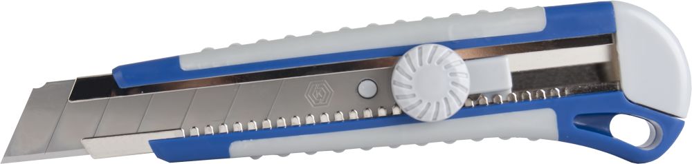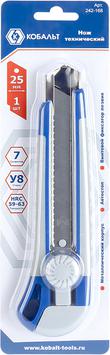 Нож КОБАЛЬТ 242-168 технический лезвие 25мм двухкомпонентный корпус металлическая направляющая. Сменное сегментированное лезвие (7 сегментов) из углеродистой инструментальной стали У8, тердостью 59-63 HRC. Применяются для разрезания тонких неплотных материалов: линолеума, пластика, проводов, упаковочной ленты, резины, картона, бумаги и других материалов. Используется с сегментированными лезвиями Кобальт: 242-052.