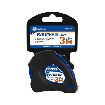 Рулетка КОБАЛЬТ Комфорт 3м x 16мм обрезиненный корпус, автостоп, магн.крючок, мат. покрытие ленты, толщина ленты 0.13 мм