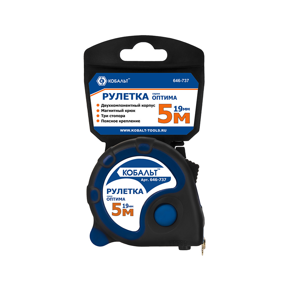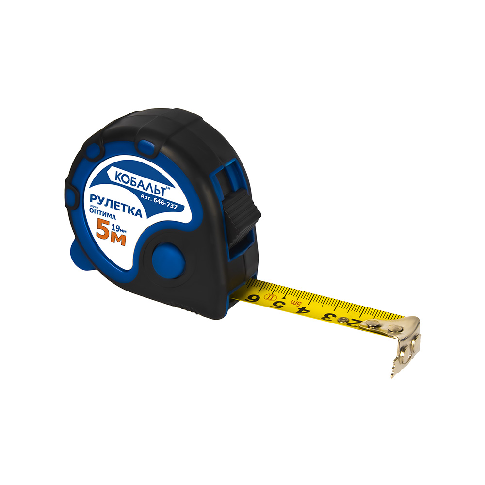 Рулетка КОБАЛЬТ Оптима 5м x 19мм, двухкомп. корпус, тройной стопор, магн.крючок, мат. покрытие ленты, толщина ленты 0.11 мм