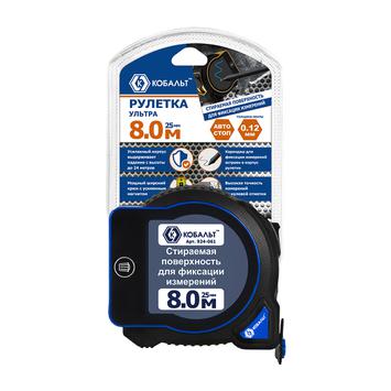 Рулетка КОБАЛЬТ УЛЬТРА 8м х 32мм, обрезиненный корпус, нейл. покр. ленты 0.13 мм, широкий магнит, тройной стопор, блист. подвес