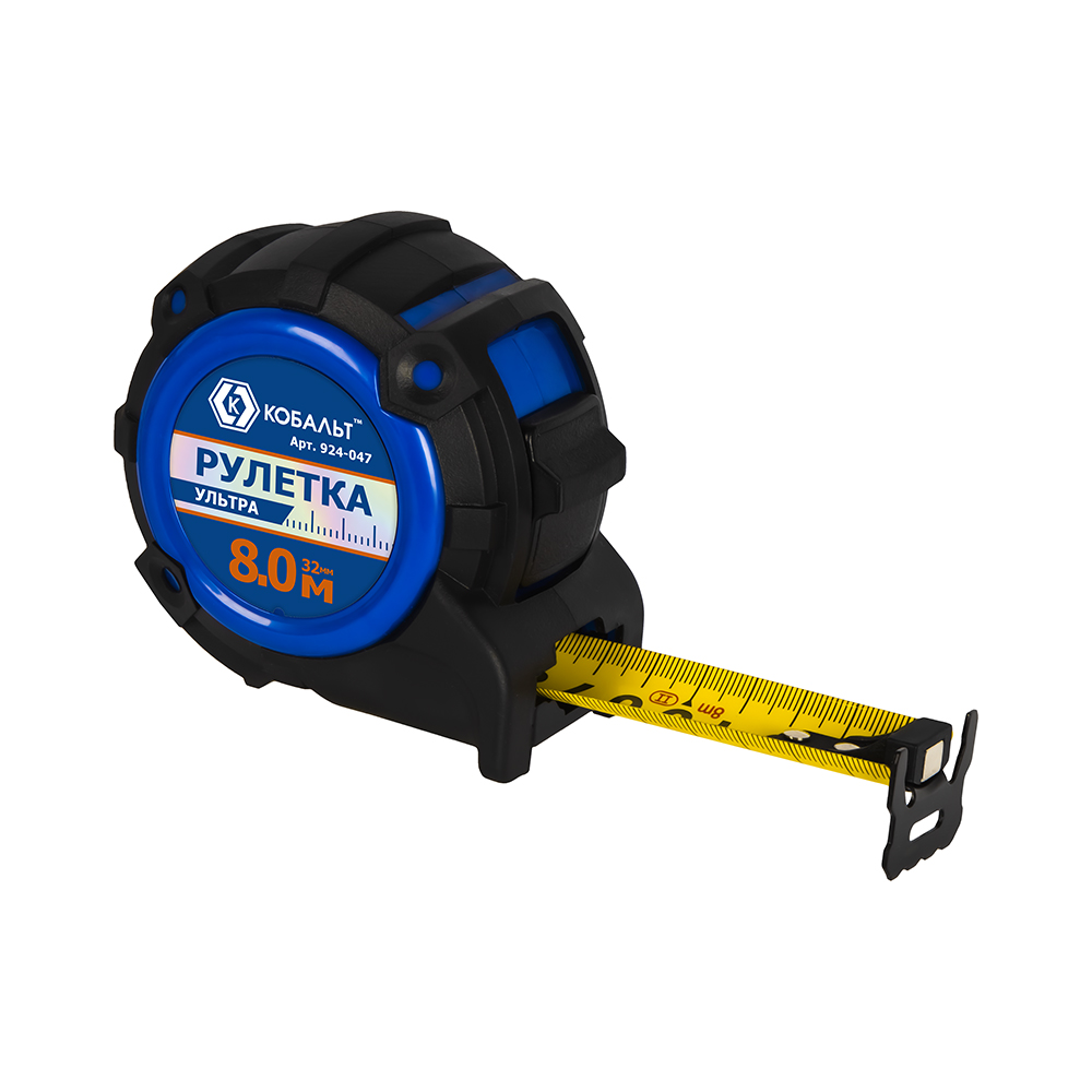 Рулетка КОБАЛЬТ УЛЬТРА 8м х 32мм, обрезиненный корпус, нейл. покр. ленты 0.13 мм, широкий магнит, тройной стопор, блист. подвес
