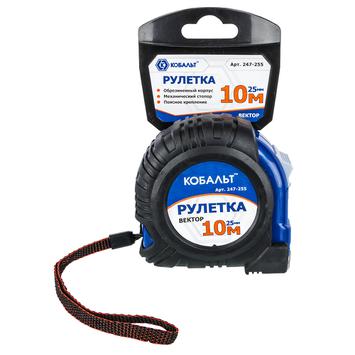 Рулетка КОБАЛЬТ Вектор 10м x 25мм, обрезиненный корп., мех.стопор, белое мат. покрытие ленты, толщина ленты 0.11 мм