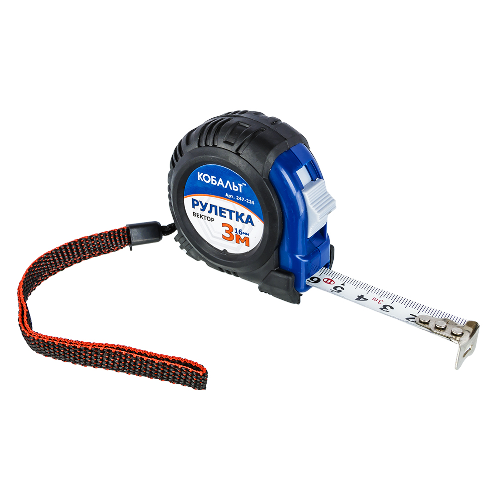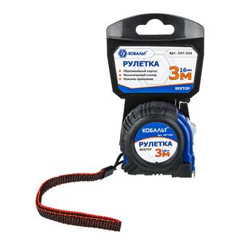 Рулетка КОБАЛЬТ Вектор 3м x 16мм обрезиненный корп., мех.стопор, белое мат. покрытие ленты, толщина ленты 0.11 мм