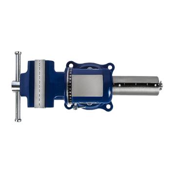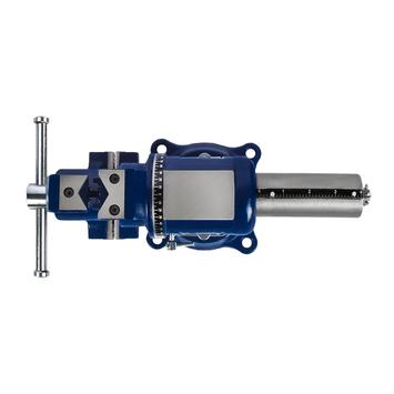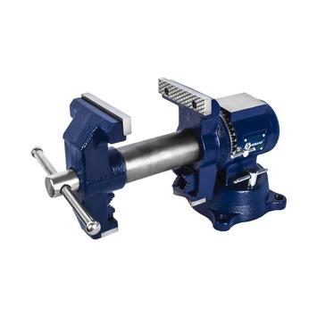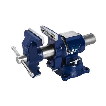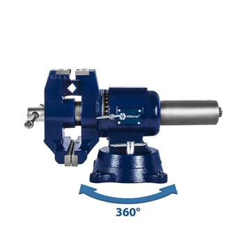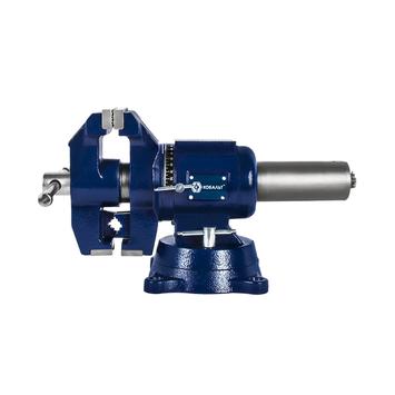 Тиски слесарные КОБАЛЬТ 246-012, поворотные в 2-х плоскостях с шириной губок 100 мм, массой 10кг , предназначены для надежной фиксации деталей для дальнейшей сборки или обработки режущим, шлифовальным или легким ударным инструментом. Изготовлены из ковкого чугуна с затягивающим винтом из углеродистой конструкционной стали. Тиски имеют прямоугольную наковальню размером 65*48 мм , для правки заготовок легким ударным инструментом. Поворотный механизм позволяет установить тиски в наиболее удобное для обработки детали положение в горизонтальной и вертикальной плоскости. На тисках предусмотрены съемные губки для возможности замены в случае их износа. Тиски имеют вспомогательный зажим с губками V-образного профиля для фиксации заготовок квадратного или круглого сечения диаметром до 110 мм, а также трубный зажим для фиксации труб диаметром до 40 мм. Крепление на верстаке с помощью 4-х болтов или саморезов не менее 8 мм в диаметре.