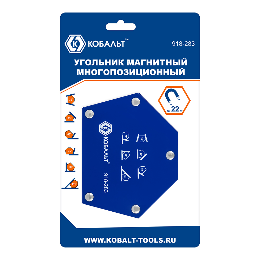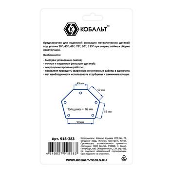Угольник магнитный КОБАЛЬТ 115 х 90 мм, на 6 углов: 30, 45, 60, 75, 90, 135 градусов, магнит до 22 кг., блистер
