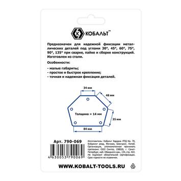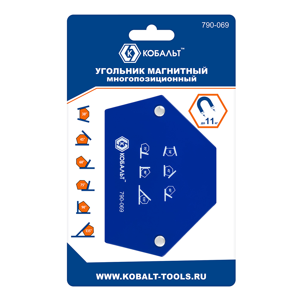 Угольник магнитный КОБАЛЬТ 95 х 48 мм, на 6 углов: 30, 45, 60, 75, 90, 135 градусов, магнит до 11 кг., блистер