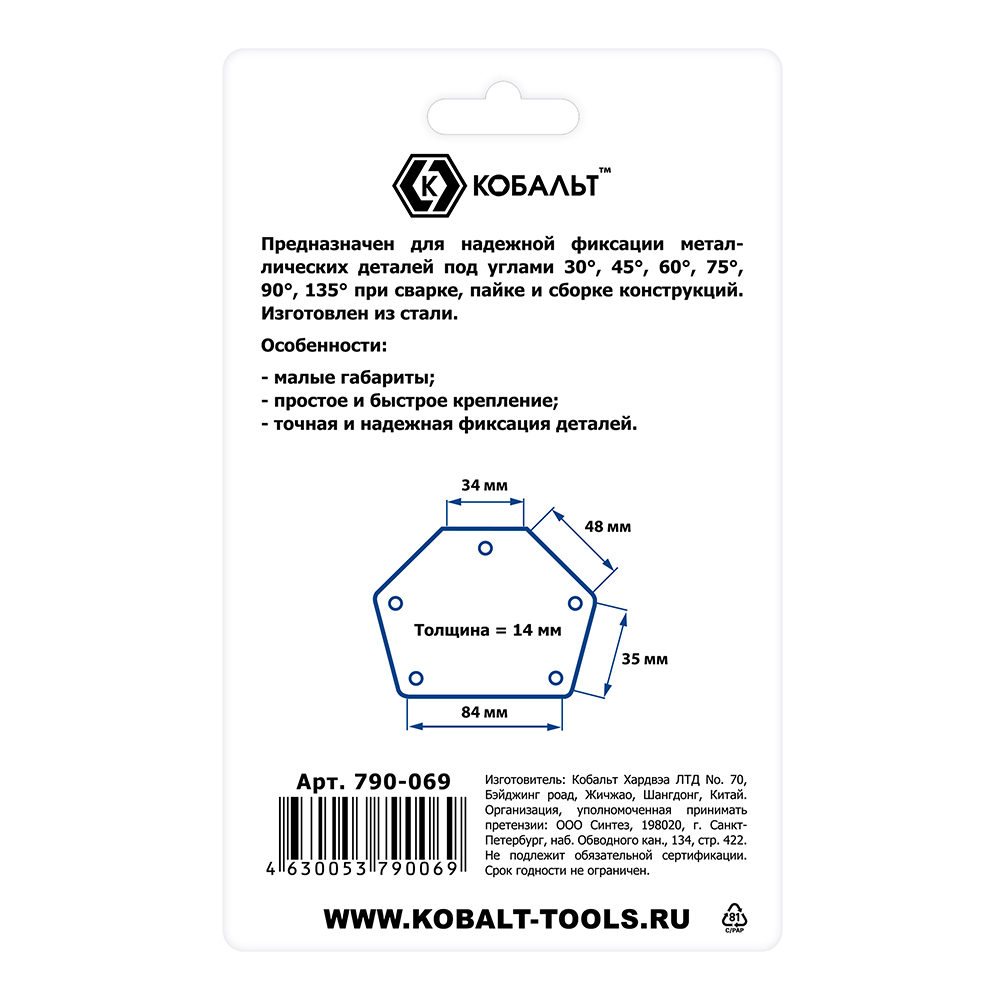 Угольник магнитный многопозиционный 95х48мм, применяется для надежной фиксации металлических деталей при сварке, пайке и сборке конструкций. Углы фиксации: 30°, 45°, 60°, 75°, 90°, 135°. Сила магнита до 11кг.