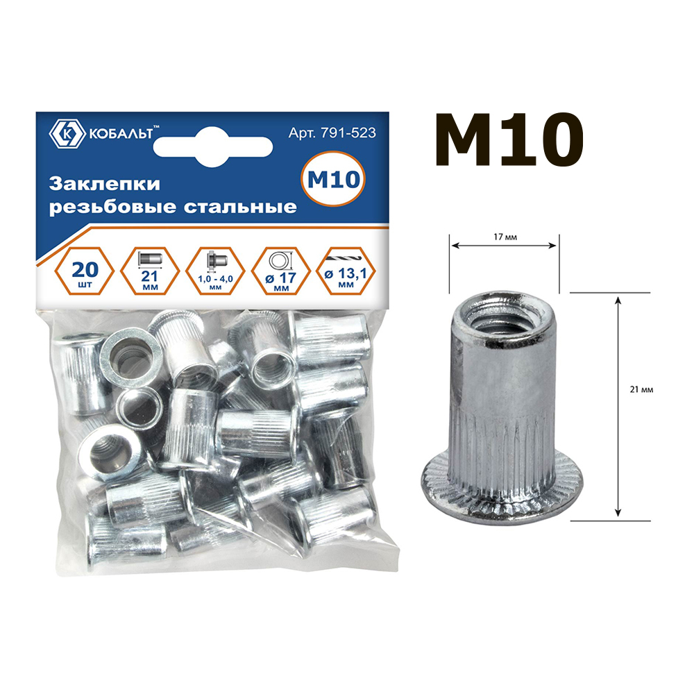 Заклепки резьбовые КОБАЛЬТ стальные, M10 х 21.5 мм, 20 ШТ/УП., подвес