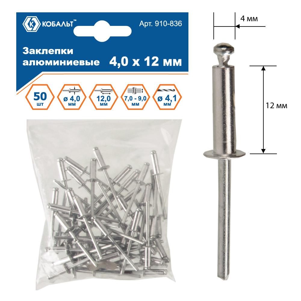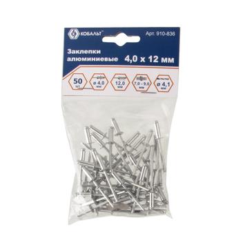 Заклепки вытяжные КОБАЛЬТ алюминиевые 4.0 х 12 мм, 50 шт., пакет с подвесом
