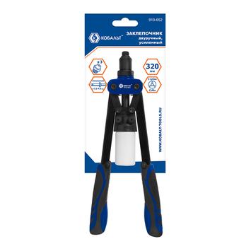 Заклепочник двуручный КОБАЛЬТ 320 мм, усиленный, заклепки 3.2-4.0-4.8 , контейнер для сбора стержней, блистер