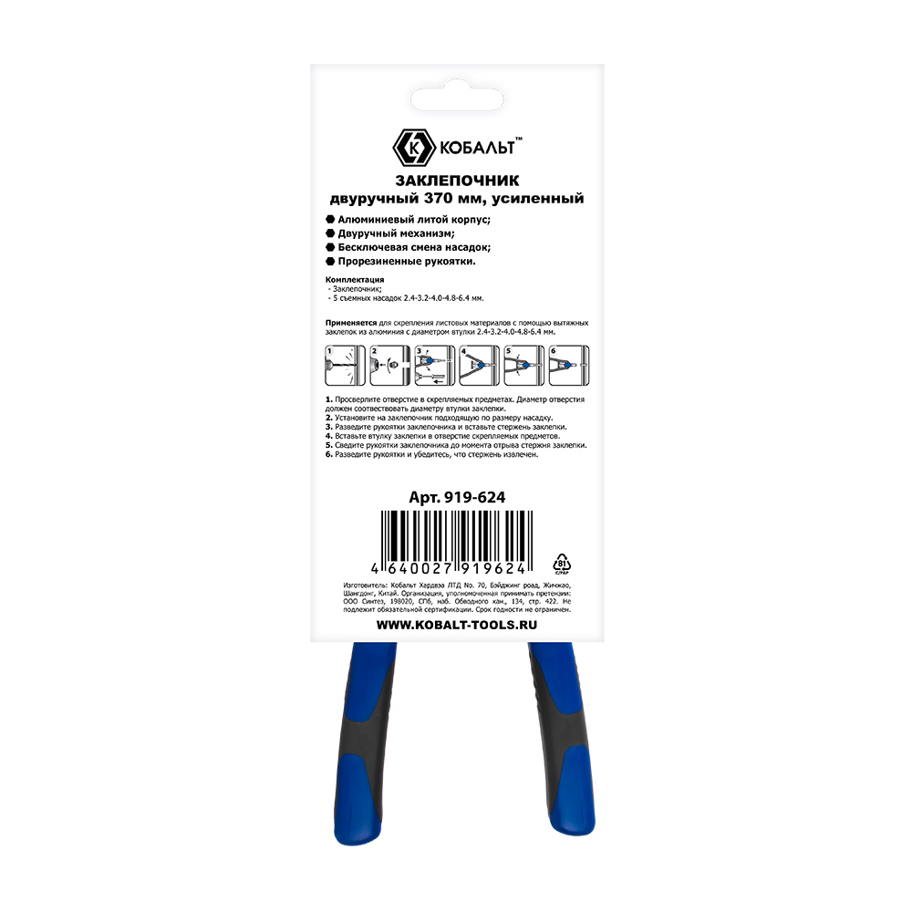 Заклепочник двуручный КОБАЛЬТ 370 мм, усиленный, заклепки 2.4-3.2-4.0-4.8-6.4 мм, блистер
